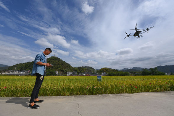 在浙江杭州市臨安區(qū)昌化鎮(zhèn)后營村,種糧大戶汪強操作農(nóng)用無人機給水稻施肥(2022年9月21日攝)。新華社記者 徐昱 攝
