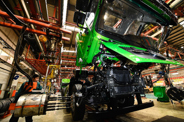 工人在中國重汽集團濟南商用車有限公司整車裝配生產(chǎn)線上作業(yè)。記者 郭緒雷 攝