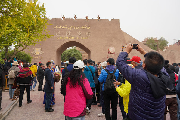 新疆喀什市,游客在開城儀式后進(jìn)入古城景區(qū)。記者 丁磊 攝