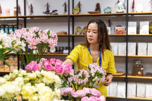 7月1日,中非經(jīng)貿(mào)博覽會常設(shè)展館展區(qū)肯尼亞館館長黃梓楠在整理產(chǎn)自非洲的鮮花。