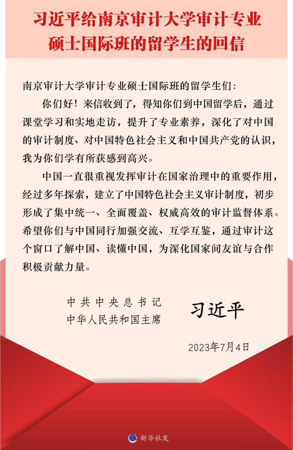 習(xí)近平在回信中說,得知你們到中國留學(xué)后,通過課堂學(xué)習(xí)和實(shí)地走訪,提升了專業(yè)素養(yǎng),深化了對(duì)中國的審計(jì)制度、對(duì)中國特色社會(huì)主義和中國共產(chǎn)黨的認(rèn)識(shí),我為你們學(xué)有所獲感到高興。