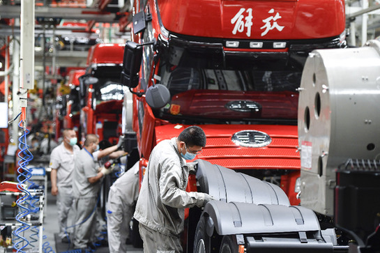 工人在一汽解放總裝車間內(nèi)裝配車輛。記者 許暢 攝