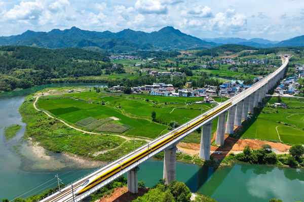 圖為試驗動車組經(jīng)過位于貴南高鐵營盤清水河雙線特大橋(無人機照片,8月4日攝)。