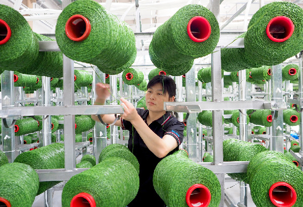 在山東省樂陵市泰山體育產(chǎn)業(yè)集團有限公司,工人在人造草坪智能化生產(chǎn)車間作業(yè)。