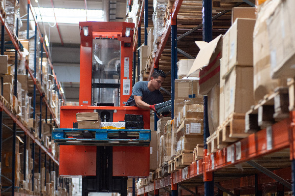 工作人員在西班牙阿爾卡拉千象盒子物流倉內(nèi)工作。