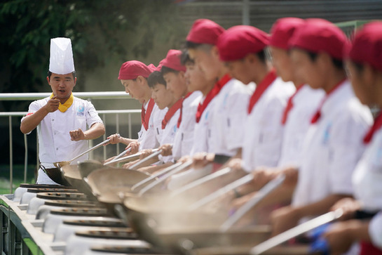 在位于西安市藍(lán)田縣的藍(lán)田廚師學(xué)校,教師成曉強(qiáng)(左一)指導(dǎo)學(xué)生們練習(xí)翻勺。新華社記者 李一博 攝