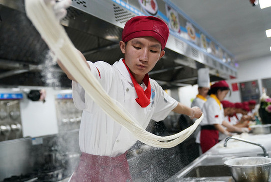 在位于西安市藍(lán)田縣的藍(lán)田廚師學(xué)校中式面點(diǎn)實(shí)訓(xùn)室,學(xué)生在練習(xí)制作面條。新華社記者 李一博 攝
