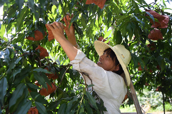 桃農在炎陵縣下村鄉(xiāng)坳頭村采摘黃桃。新華社記者 薛宇舸 攝