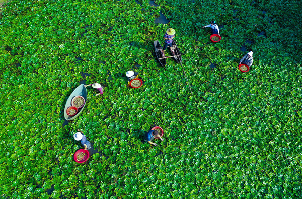 8月24日,河南省信陽市光山縣司馬光小鎮(zhèn)升輝合作社農(nóng)民在采摘菱角(無人機(jī)照片)。