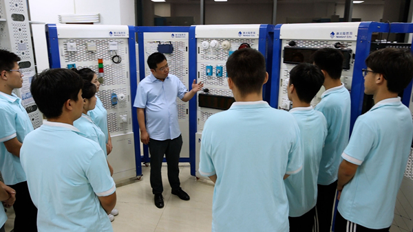 劉少坤(中間)在計(jì)算機(jī)技術(shù)系物聯(lián)網(wǎng)綜合項(xiàng)目實(shí)訓(xùn)室指導(dǎo)學(xué)生進(jìn)行物聯(lián)網(wǎng)應(yīng)用程序設(shè)計(jì)操作。