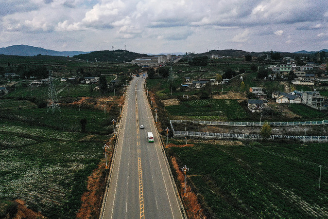 鄉(xiāng)鎮(zhèn)公交車行駛在貴州省威寧縣迤那鎮(zhèn)開(kāi)往牛棚鎮(zhèn)的公路上(無(wú)人機(jī)照片)。資料照片