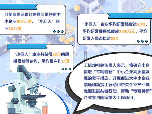 此外,來自工信部的數(shù)據(jù)顯示,從創(chuàng)新投入看,“小巨人”企業(yè)平均研發(fā)強(qiáng)度達(dá)6.3%,平均研發(fā)費(fèi)用總額超3100萬元,平均研發(fā)人員占比達(dá)28%,創(chuàng)新投入遠(yuǎn)高于其他同等規(guī)模企業(yè)。從創(chuàng)新產(chǎn)出看,“小巨人”企業(yè)共獲得20萬余項(xiàng)授權(quán)發(fā)明專利,平均每戶約17項(xiàng)。