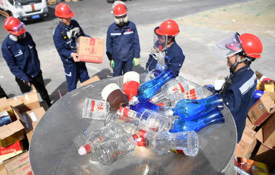 工作人員在對假冒白酒進(jìn)行無害化銷毀。資料照片