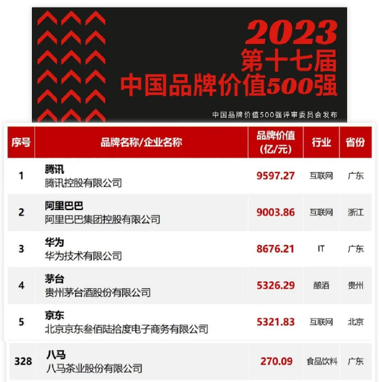 △八馬茶業(yè)上榜中國品牌價(jià)值500強(qiáng),名列榜單第328位,品牌價(jià)值達(dá)270.09億元。