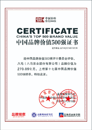 八馬茶業(yè)連續(xù)8年上榜中國品牌價(jià)值500強(qiáng),品牌價(jià)值達(dá)270.09億元