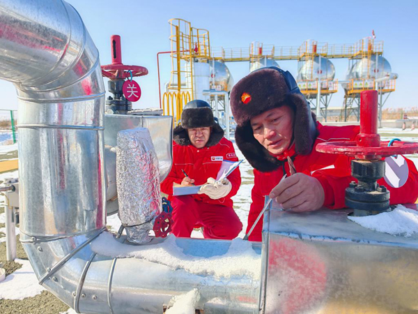 “低溫天氣里,儀表可能凍堵造成失靈或高壓,咱們要隨時觀察數(shù)據(jù)變動,及時調(diào)整參數(shù)?!焙钣駛サ慕廾兔济蠏鞚M冰霜,不時對著凍僵的手哈口熱氣。