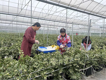 圖為藍莓種植大棚內,工人正在忙碌采摘。熊嘉藝攝