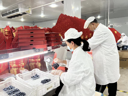 圖為藍莓冷庫內,工人正在分揀包裝春節(jié)藍莓禮盒。 熊嘉藝攝