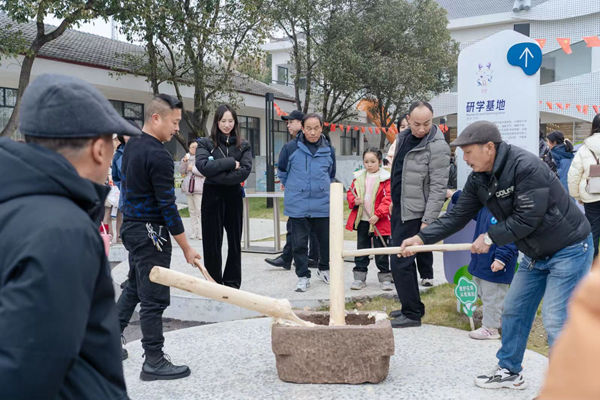 游客在麻陽縣楠木橋村云端叢林研學(xué)基地體驗打糍粑。鄒斌 攝