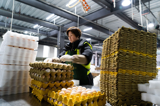 2月20日,安徽田園居電子商務(wù)股份有限公司物流員工正在將分揀好的雞蛋打包寄出。記者 趙金正 攝