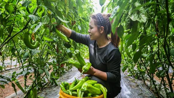 圖為赤峰市寧城縣種植戶在大棚內(nèi)采摘尖椒。(王中文 攝)
