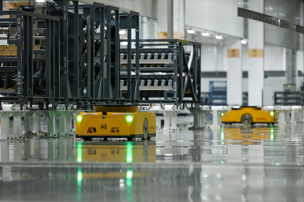 從空中俯瞰大眾安徽MEB工廠,一輛輛大貨車陸續(xù)排隊進入園區(qū),運送物料;步入車間,AGV小車有序往來,準備出口歐洲的訂單正在這里抓緊生產(chǎn)等待交付。