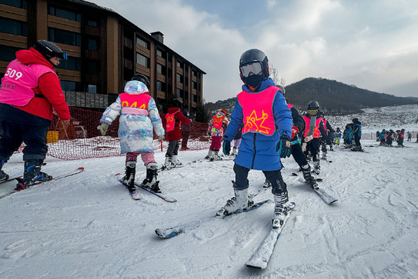2023年12月5日,在吉林省吉林市萬(wàn)科松花湖度假區(qū),小朋友們?cè)诮叹毜闹笇?dǎo)下練習(xí)滑雪動(dòng)作。 記者 許暢 攝