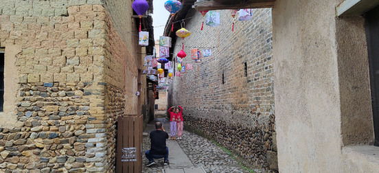 游客在太平堡景區(qū)圍屋邊拍照留影。 記者 李美娟 攝