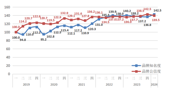 圖為2019年至2024年西鳳酒品牌公信度、知名度分項(xiàng)指數(shù)