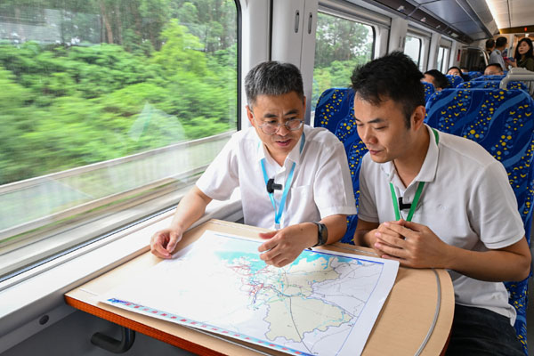圖為當日,中鐵第一勘察設計院集團有限公司廣佛南環(huán)總設計師韓振江(左)介紹剛剛投入運營的廣佛南環(huán)、佛莞城際鐵路的設計思路。記者 劉大偉 攝