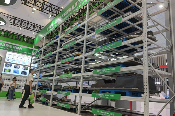 一家企業(yè)展示的回收的新能源汽車動力電池。資料照片