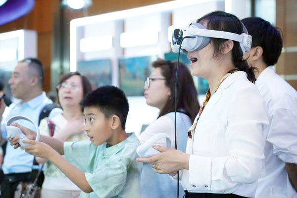 7月2日至5日,以“開啟數(shù)智新時(shí)代,共享數(shù)字新未來”為主題的2024全球數(shù)字經(jīng)濟(jì)大會在北京國家會議中心舉辦。圖為7月2日,觀眾在2024全球數(shù)字經(jīng)濟(jì)大會數(shù)字經(jīng)濟(jì)沉浸式體驗(yàn)區(qū)體驗(yàn)一款VR設(shè)備。新華社記者 任超 攝