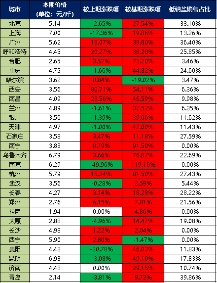 分價格區(qū)間來看,本期超市食用鹽銷售單價在5元/斤以上的城市有8個,分別是北京、上海、廣州、烏魯木齊、南京、杭州、西寧、昆明;超市食用鹽銷售單價在4-5元/斤之間的城市有9個,分別是呼和浩特、重慶、南昌、蘭州、天津、長春、長沙、貴陽、濟南;超市食用鹽銷售單價在3-4元/斤之間的城市有6個,分別是哈爾濱、西安、銀川、石家莊、南寧、武漢;超市食用鹽銷售單價在3元/斤以下的城市有5個,分別是合肥、鄭州、拉薩、太原、青島。