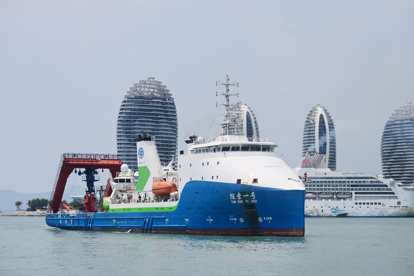 ??“探索一號”科考船搭載“奮斗者”號全海深載人潛水器返回海南三亞(2024年3月28日攝)。此次科考?xì)v時(shí)50天,順利完成中國-印度尼西亞爪哇海溝聯(lián)合深潛任務(wù)。新華社發(fā)(沙曉峰 攝)