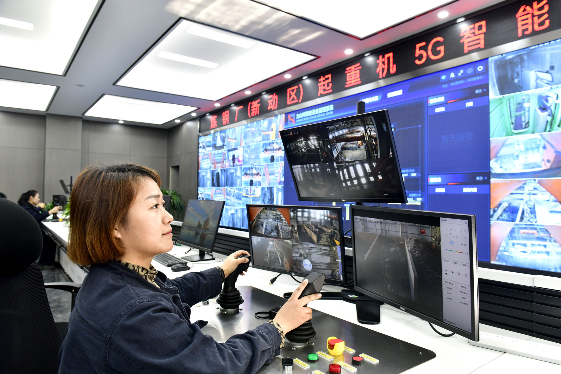 圖為工作人員在山鋼股份萊蕪分公司煉鋼廠起重機5G智能管控中心遙控操作吊運廢鋼。新華社記者 郭緒雷 攝