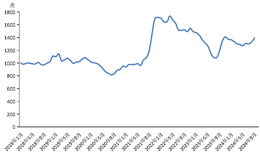 9月份,新華·中鹽兩堿工業(yè)鹽價(jià)格指數(shù)報(bào)1393.68點(diǎn),較上期(2024年8月)上漲63.73點(diǎn),漲幅4.79%;較基期(2018年1月)上漲393.68點(diǎn),漲幅39.37%;較周期內(nèi)最高點(diǎn)1736.66點(diǎn)(2022年4月)下跌342.98點(diǎn),跌幅19.75%;較周期內(nèi)最低點(diǎn)816.2點(diǎn)(2020年8月)上漲577.48點(diǎn),漲幅70.75%。