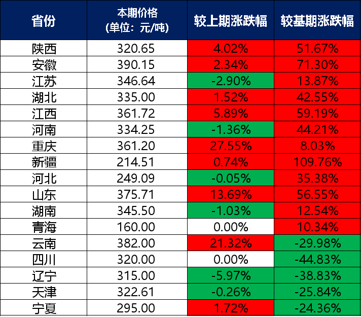 分價(jià)格區(qū)間來看,本期兩堿工業(yè)鹽單價(jià)在300元/噸及以上的地區(qū)有13個(gè),是陜西、安徽、江蘇、湖北、江西、河南、重慶、山東、湖南、云南、四川、遼寧、天津;兩堿工業(yè)鹽單價(jià)在300元/噸以下的地區(qū)有4個(gè),分別是新疆、河北、青海、寧夏。