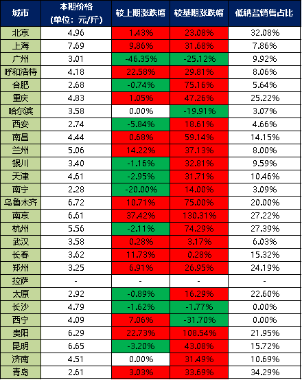 分價格區(qū)間來看,本期超市食用鹽銷售單價在5元/斤以上的城市有7個,分別是上海、蘭州、烏魯木齊、南京、杭州、貴陽、昆明;超市食用鹽銷售單價在4-5元/斤之間的城市有8個,分別是北京、呼和浩特、重慶、南昌、天津、長沙、西寧、濟南;超市食用鹽銷售單價在3-4元/斤之間的城市有6個,分別是廣州、哈爾濱、銀川、武漢、長春、鄭州;超市食用鹽銷售單價在3元/斤以下的城市有5個,分別是合肥、西安、南寧、太原、青島。