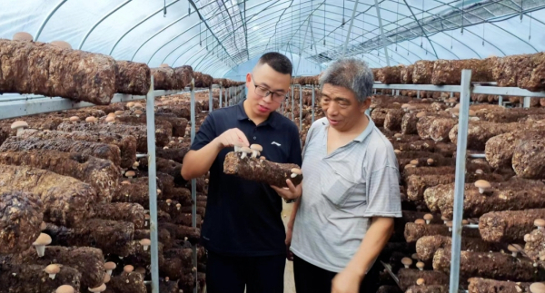 茅臺集團(tuán)駐道真縣長壩村第一書記龔利科和菇農(nóng)交流菌菇種植情況