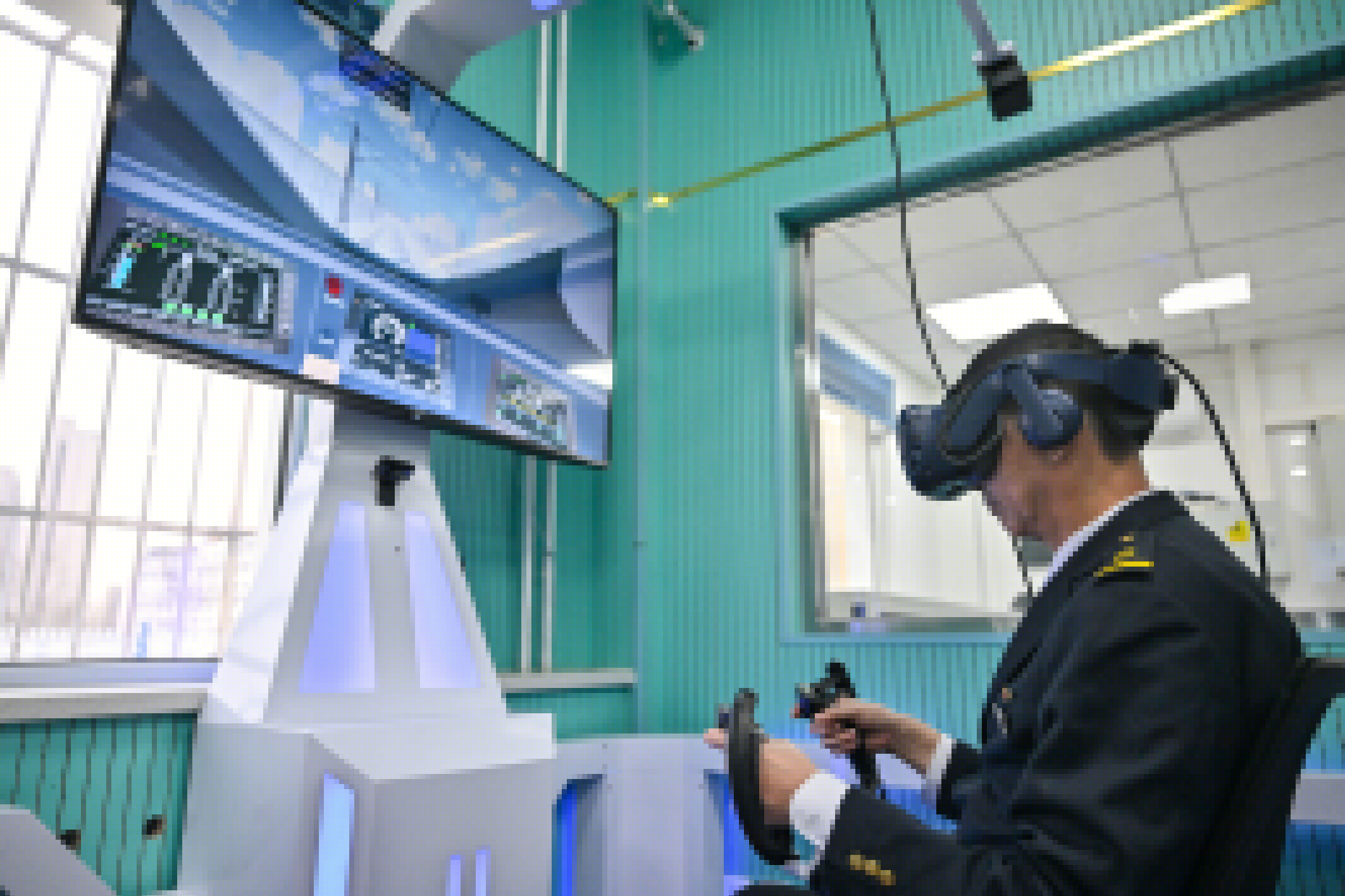 世界首條智能高鐵京張高鐵即將迎來(lái)通車(chē)五周年。據(jù)了解,通車(chē)近五年來(lái),鐵路部門(mén)通過(guò)5G技術(shù)、北斗系統(tǒng)、智慧大腦、機(jī)器人檢修等各種科技手段,保障京張高鐵安全平穩(wěn)運(yùn)行。圖為近日在國(guó)鐵北京動(dòng)車(chē)段北京北動(dòng)車(chē)運(yùn)用所,動(dòng)車(chē)組司機(jī)安秀旗使用VR模擬駕駛設(shè)備訓(xùn)練。