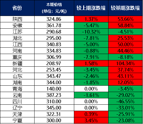 分價(jià)格區(qū)間來看,本期兩堿工業(yè)鹽單價(jià)在300元/噸及以上的地區(qū)有12個(gè),分別是陜西、安徽、江西、河南、重慶、山東、湖南、云南、四川、遼寧、天津、寧夏;兩堿工業(yè)鹽單價(jià)在300元/噸以下的地區(qū)有5個(gè),分別是江蘇、湖北、新疆、河北、青海。