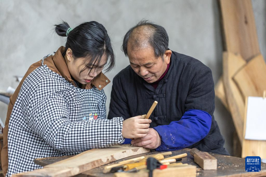 1月14日,在重慶市梁平區(qū)屏錦鎮(zhèn),梁平木版年畫國家級代表性傳承人徐家輝(右)指導學生熊彩汝梁平木版年畫技藝。