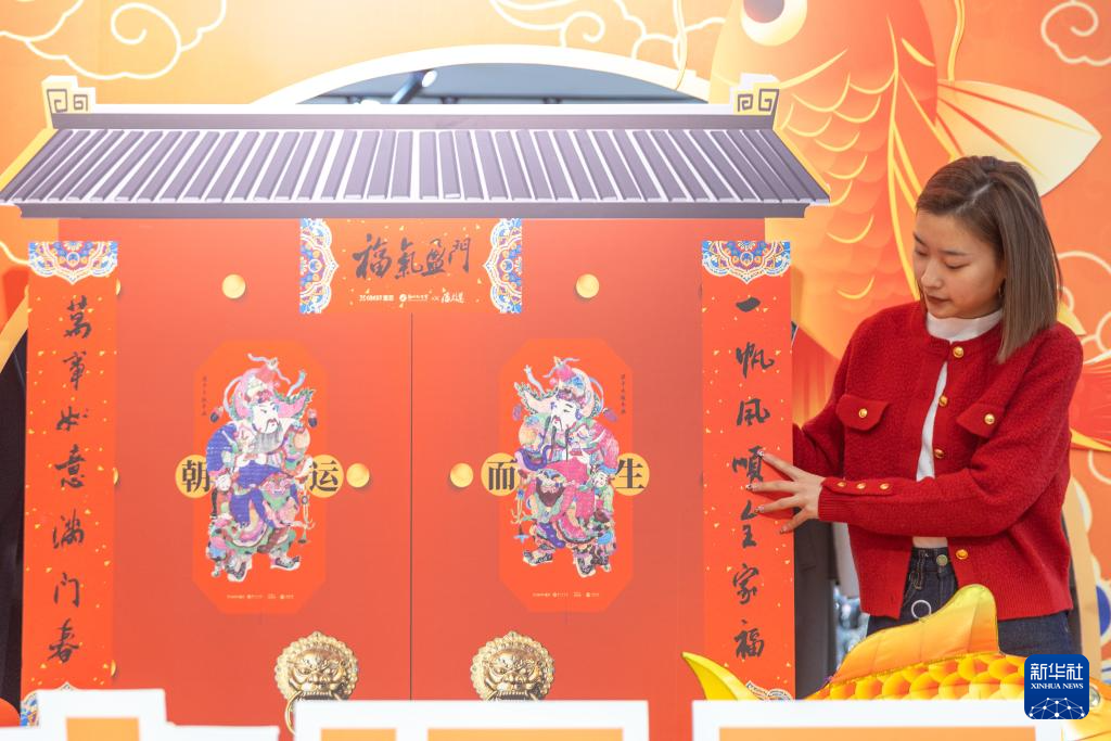 1月15日,在重慶市梁平區(qū)一商場,商場工作人員在擺放帶有梁平木版年畫元素的新春裝飾。