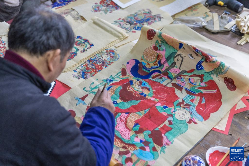 1月14日,在重慶市梁平區(qū)屏錦鎮(zhèn),梁平木版年畫國家級代表性傳承人徐家輝在工作室內為年畫描色。