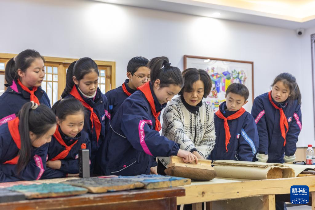 1月15日,在重慶市梁平區(qū)梁平實驗小學少兒年畫館,梁平木版年畫市級代表性傳承人莫紹萍指導學生們學習梁平木版年畫的刷印。