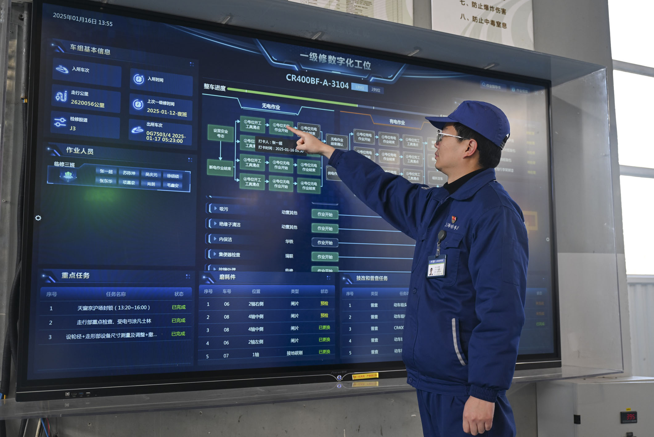 圖為近日在上海動車段虹橋動車運(yùn)用所,工長在操作一級修數(shù)字化工位界面。