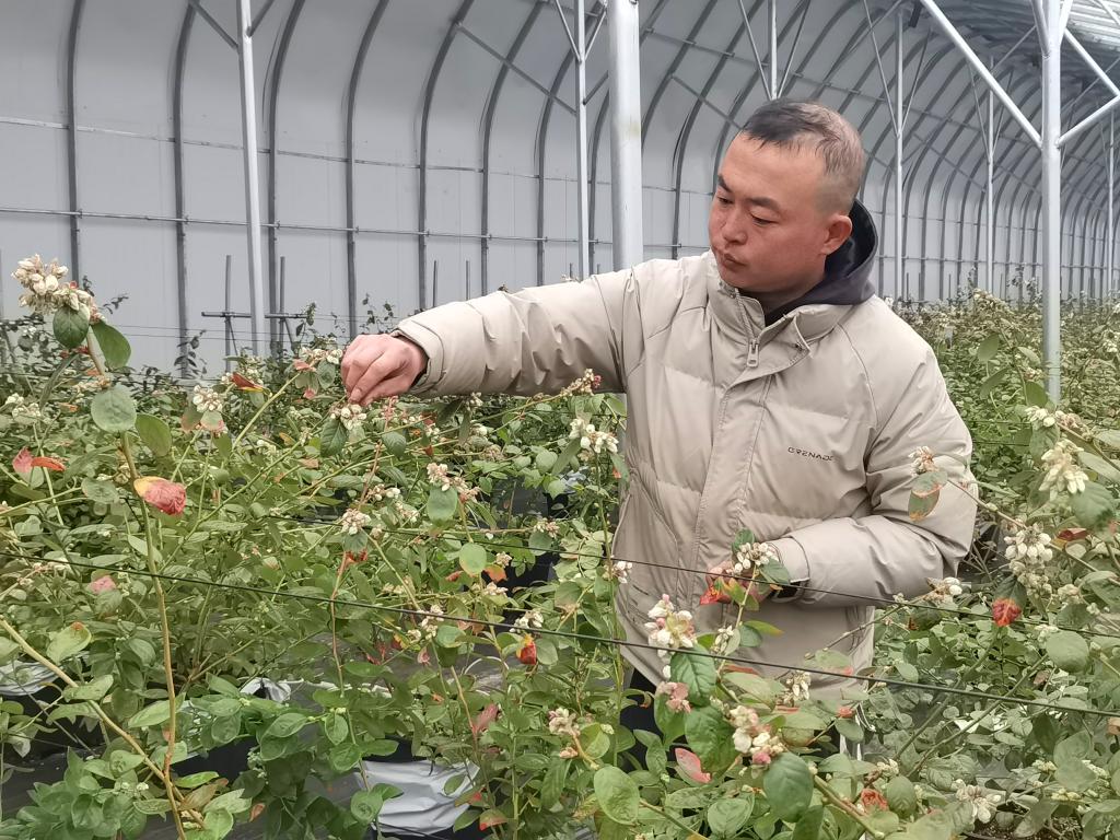 1月23日,何曉磊在鳳陽小崗藍(lán)莓產(chǎn)業(yè)發(fā)展有限公司管護(hù)藍(lán)莓。新華社記者 水金辰 攝