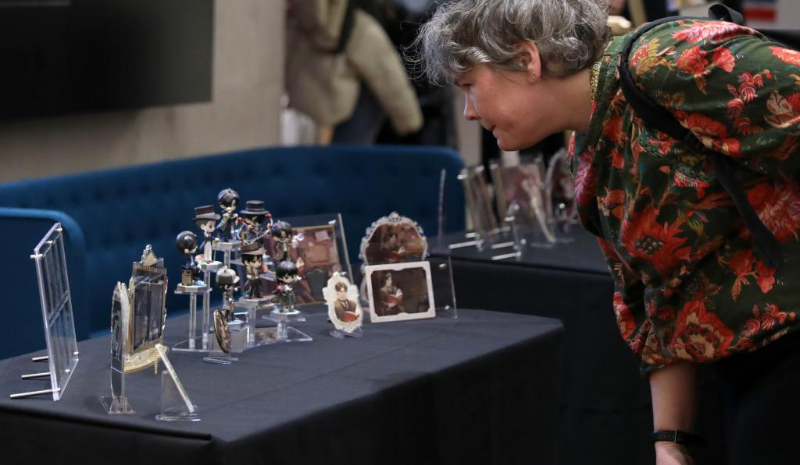 2024年11月21日,在英國倫敦大英圖書館,一名女子觀看中國網(wǎng)絡(luò)文學(xué)作品的周邊產(chǎn)品。新華社記者李穎攝