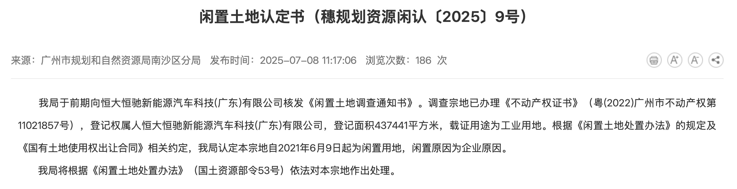 認(rèn)定書顯示,該宗地已辦理不動(dòng)產(chǎn)權(quán)證書(粵(2022) 廣州市不動(dòng)產(chǎn)權(quán)第11021857號(hào)),登記面積達(dá)437441平方米,土地用途為工業(yè)用地,權(quán)屬歸恒大恒馳新能源汽車科技(廣東)有限公司所有。依據(jù)《閑置土地處置辦法》相關(guān)規(guī)定以及《國(guó)有土地使用權(quán)出讓合同》約定,因企業(yè)自身原因,自2021年6月9日起,該宗地被判定為閑置用地。