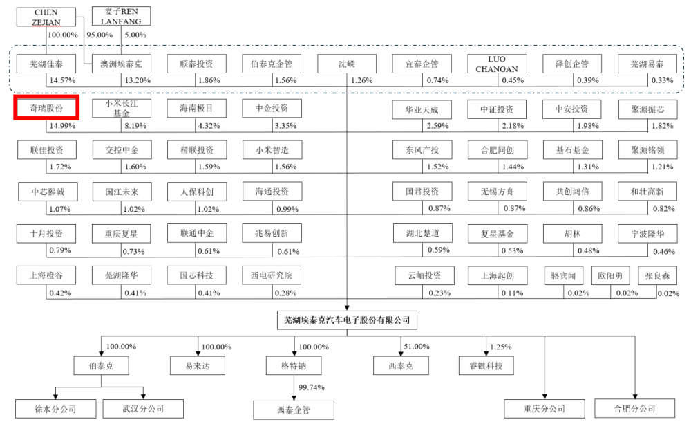 埃泰克前身為埃泰克有限,系由澳洲埃泰克、奇瑞科技共同出資設(shè)立。埃泰克有限設(shè)立時的股權(quán)結(jié)構(gòu)奇瑞科技出資占比為49%。據(jù)天眼查顯示,奇瑞科技是奇瑞汽車的全資子公司??梢哉f埃泰克從設(shè)立之初就有奇瑞汽車的影子。